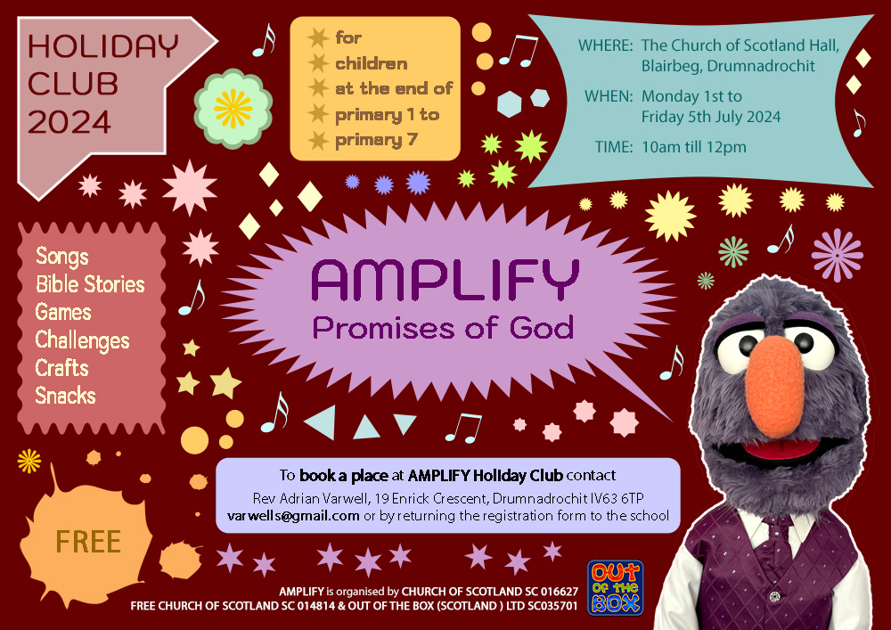 Are you in primary school? Not sure what to do for the first week of the holidays? Join us for five fun filled mornings next Monday – Friday, 1st – 5th July, in the Church of Scotland Hall at our Amplify Children’s Holiday Club led by Out of the Box (Scotland) Ltd . See poster for details of how to register.