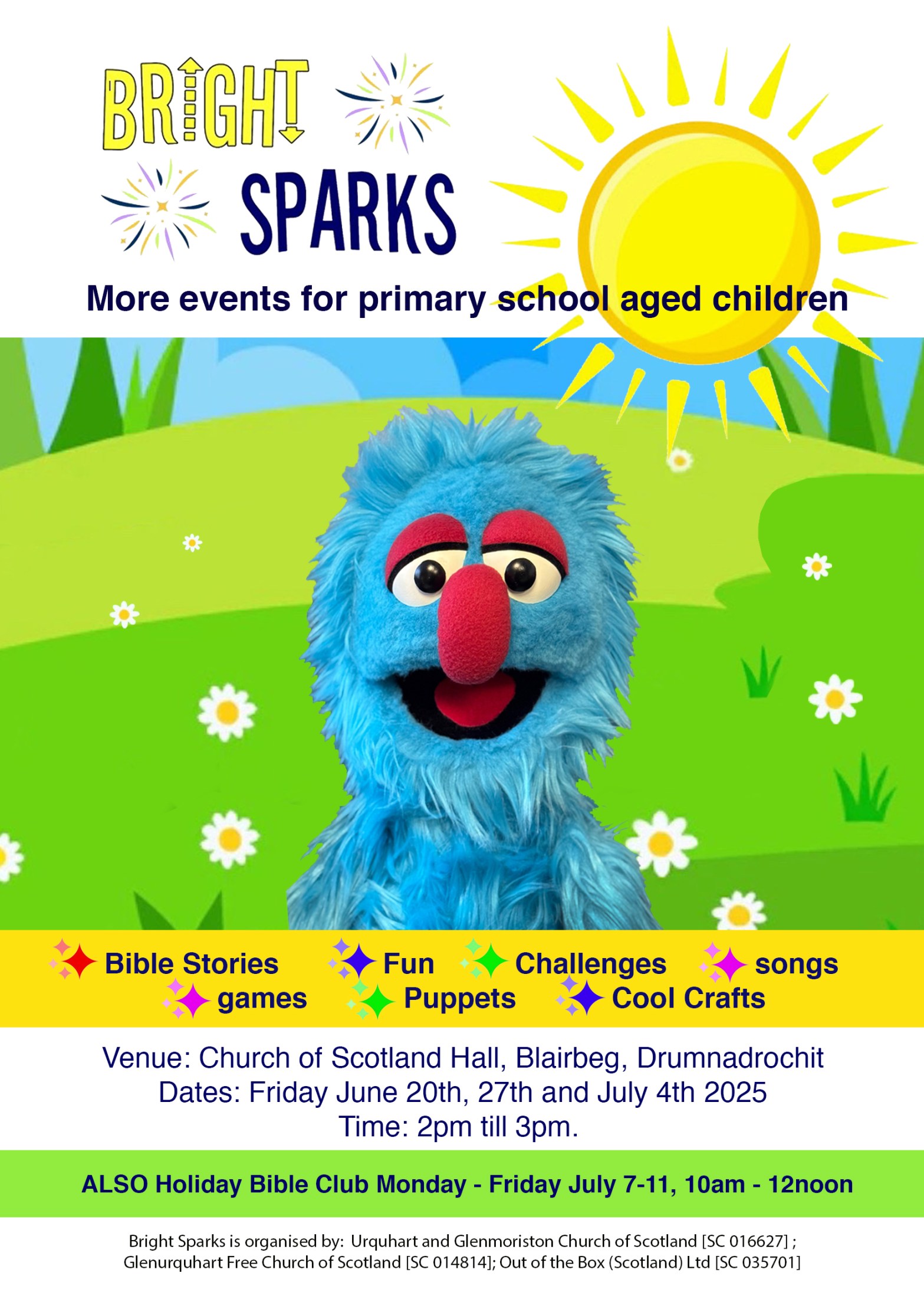 Also, save the dates for our Bright Sparks Holiday Bible Club, also in the Church of Scotland Hall during the first week of the school holidays, Monday 7th – Friday 11th July from 10.00 am – 12.00 noon.